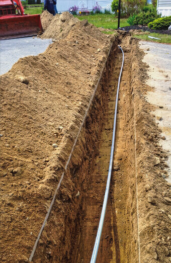 Compliant trenching and electrical conduit installation for underground mains, including proper backfill, warning tape, and compaction where required.